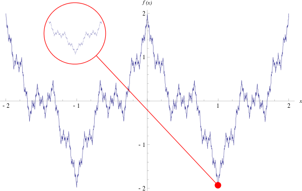 \displaystyle  f(x) = \sum_{k=1}^{\infty} a^{k} cos(b^{k}\pi x),